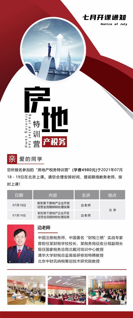 導讀:房地產稅務特訓研修班7月上課通知 房地產稅務特訓營2021年7月學費:4980元,開課時間:2021年7月18-19日。 授課內容:新形勢下房地產企業開發經營全流程納稅處理實操 主講老師:邊老師(中國注冊稅務師,中國著名財稅三棲實戰專家)